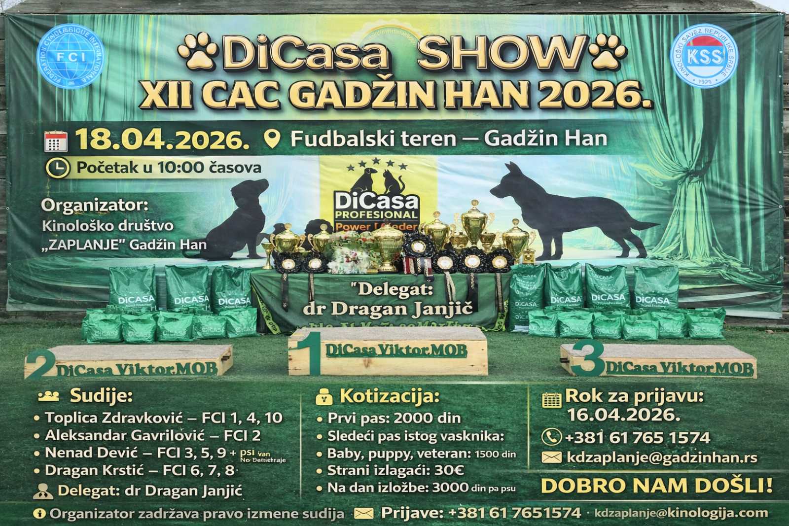 Кинолошко друштво „ЗАПЛАЊЕ“ Гаџин Хан, организује XII Националну лзложбу паса свих раса 18. априла 2026.године са почетком у 10 часова на фудбалском терену у Гаџином Хану.