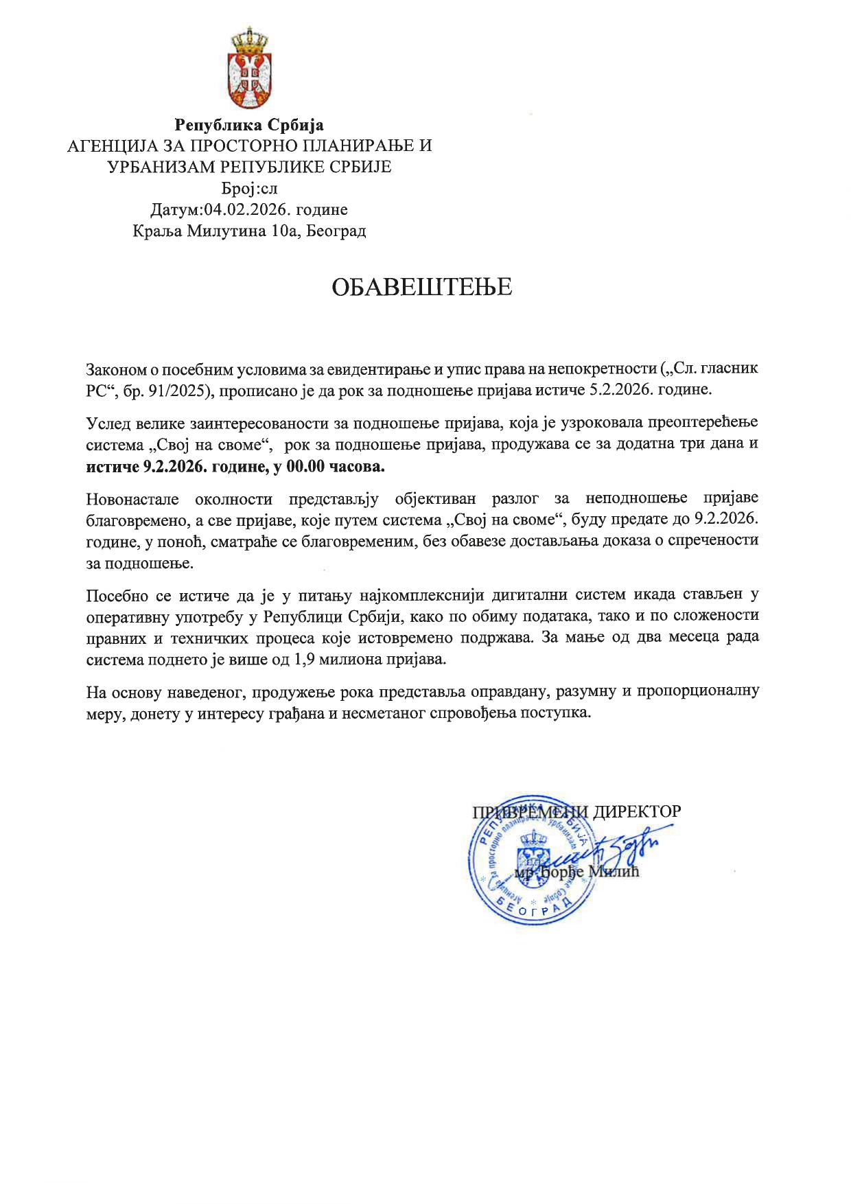 ОБАВЕШТЕЊЕ О ПРОДУЖЕЊУ РОКА ЗА ПРИЈАВЕ